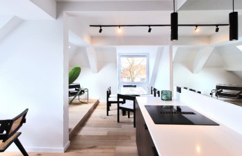 Lentrée mène dune part aux pièces de vie: le salon, la salle à manger avec attenante, une cuisine contemporaine super équipée (avec électro siemens, taque à induction avec hotte intégrée au charbon actif et cave à vin 50 btl.).