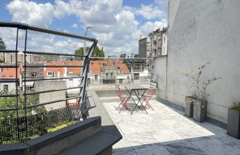 À l'étage supérieur : deux chambres, une salle de douche ainsi qu'une kitchenette (actuellement une seule grande suite). Une grande terrasse arrière offre une vue époustouflante sur Bruxelles, tandis qu'une petite terrasse à l'avant est idéale pour les petits-déjeuners au soleil.