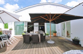 La première unité est un loft duplex d'environ 315 m². L'étage principal comprend un vaste espace de vie d'environ 160 m² avec feu ouvert et accès direct à une terrasse orientée sud-ouest d'environ 50 m². À l'arrière, la cuisine contemporaine hyper équipée dispose d'un accès à une seconde terrasse. Une chambre en suite avec salle de bains et accès extérieur complète ce niveau. En mezzanine, une seconde chambre avec dressing et salle de douches ouverte sur le séjour. Hammam privé, buanderie, cave, garage intérieur et absence de charges communes. Possibilité d'aménager facilement une troisième chambre.